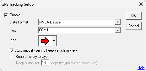 6) Click the OK Button and a white dot or arrow will appear on the screen and update its location about every second.